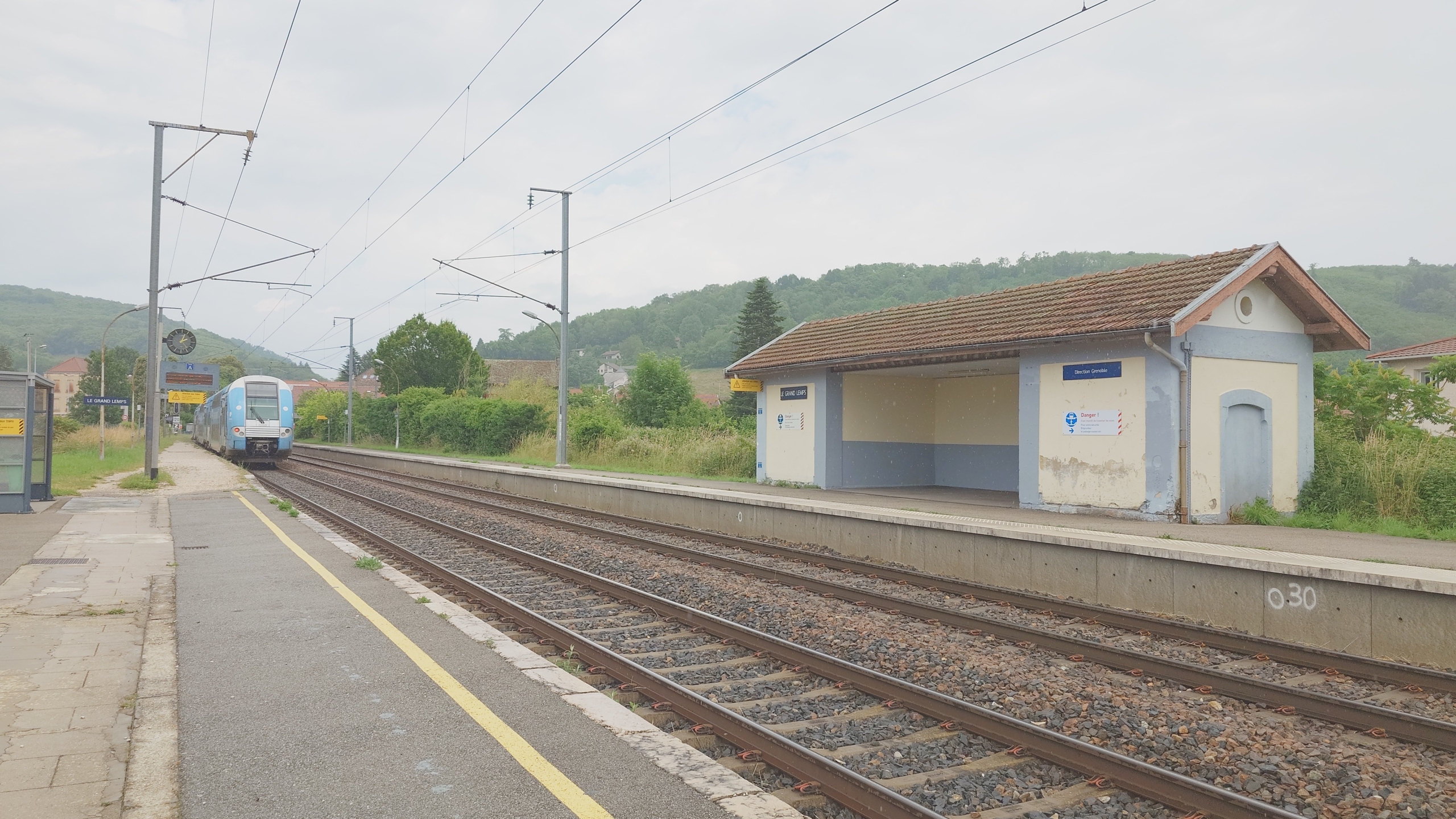 当初予定は7時16分発の電車に乗る予定でしたが、買い物で時間を要したため12時16分発と約5時間遅い出発になりました。途中ボアロン(Voiron)まで行って、一昨年のゴールであるル・グロン=ラン(Le Grand-Lemps)まで引き返しました。